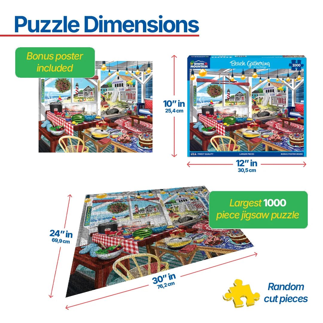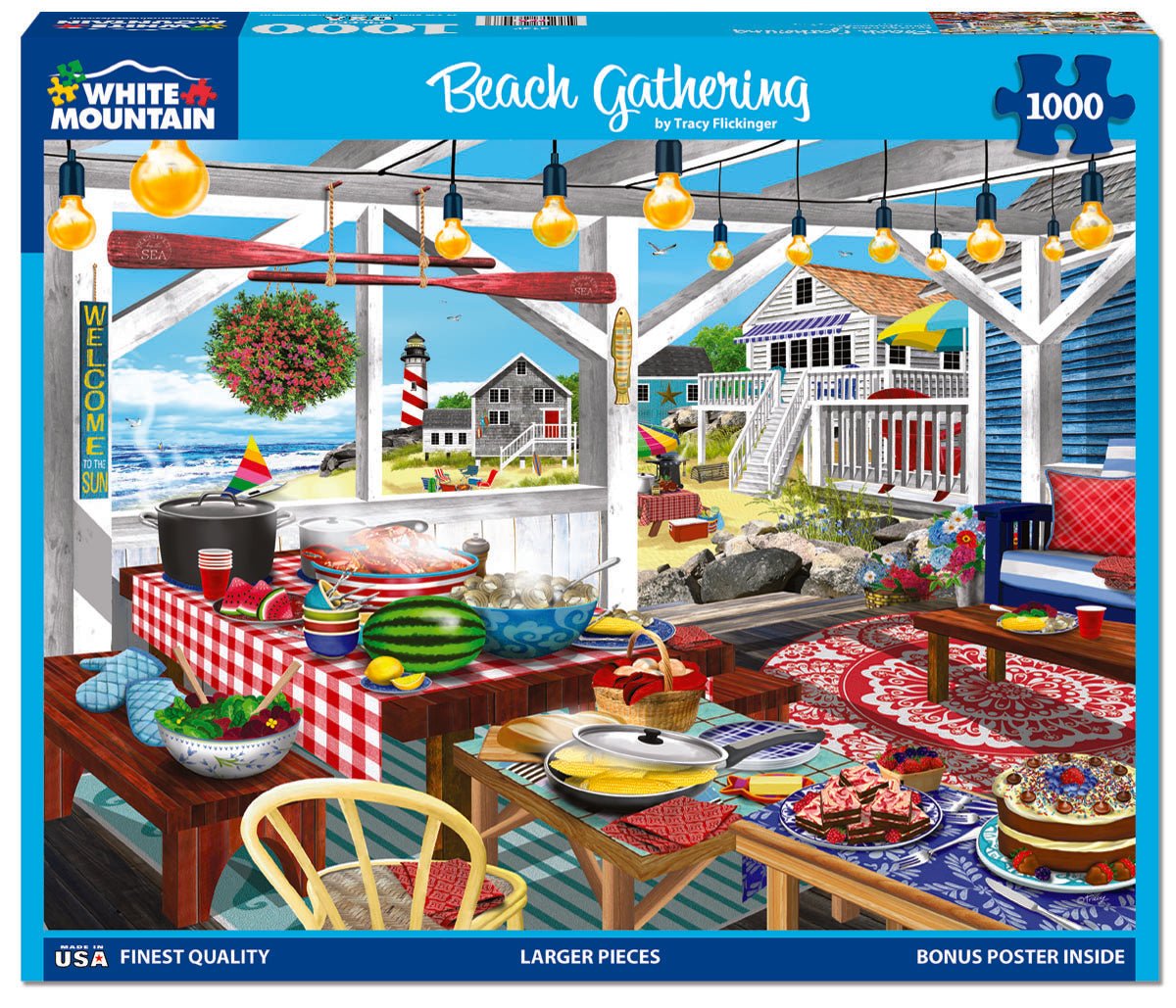 2129 Beach Gathering. The ocean breeze, the sound of seagulls, and the scent of a summer feast fill the air. The table is set with all the summer favorites – juicy watermelon, fresh salad, buttery corn, steaming seafood, and sweet desserts that beg for second helpings. Artist Tracy Flickinger reminds you that a Beach Gathering is the perfect place to soak up the season in this 1000 piece jigsaw puzzle. Finished size 24" x 30".