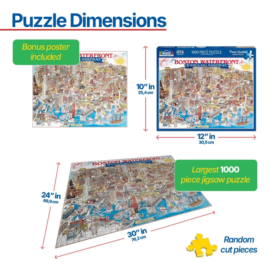 This Boston puzzle salutes the city and what it has to offer. The clever illustration shows Boston's historic Waterfront and Faneuil Hall Marketplace in all their glory, and includes sites like Quincy Market, City Hall and more. This puzzle serves as a perfect memento of a trip to Boston or a great gift for those from Boston who have since relocated. Artist Maureen Rupprecht & Pat Sustendal: 1000 piece jigsaw puzzle: Finished size 24" X 30".