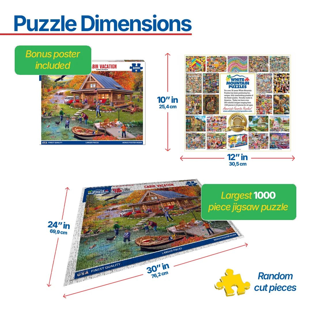 2089 Cabin Vacation Seek & Find. There is always so much to see and do when you’re at the cabin on vacation. Fish, swim, or watch the nearby residents as they go about their day. Artist Mary Thompson designed this 1000 piece seek and find puzzle for all the nature lovers out there. Can you find all the hidden objects? Finished size 24" x 30".