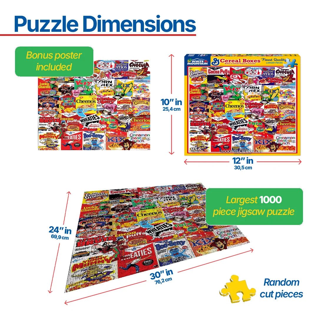 1261 Cereal Boxes. Here's our new and improved image of this super-popular puzzle with all new artwork from General Mills. Imagine yourself watching Saturday morning cartoons with a heaping bowl of Cocoa Puffs, Kix, or Lucky Charms. Perhaps you're a bit more mature and prefer Cheerios, Total, or Wheaties - but never forget, Silly Rabbit, Trix Are For Kids! 1,000 pieces with a finished size 24" x 30".