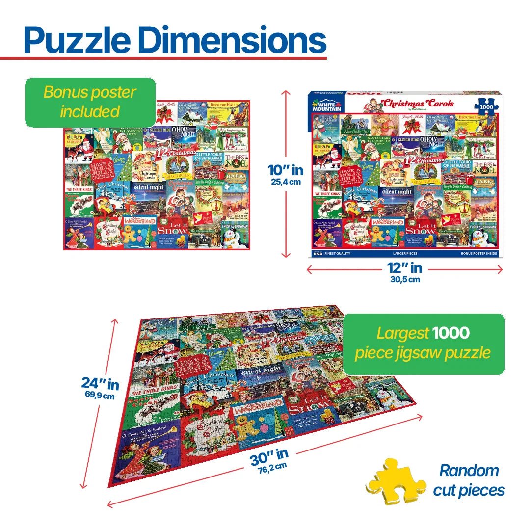 1721pz Christmas Carols. Hark the Herald Angels Sing, We Three Kings, O Come All Ye Faithful, and more. Artist Mark Karvon gathered some of the most recognizable Christmas Carols that have survived the times in this collage style 1000 piece jigsaw puzzle. Finished size of 24” x 30”.