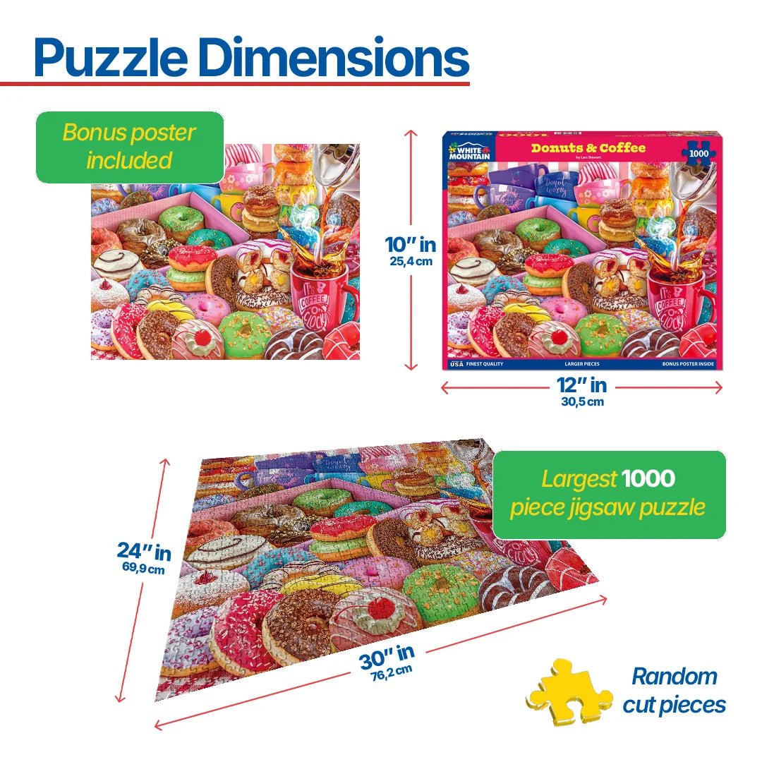 1869 Donuts & Coffee. Powdered, glazed, or filled. Soft sweet confections that are perfectly paired with a hot steaming cup of joe come in all shapes and sizes with toppings that can rival your imagination. Artist Lars Stewart designed this colorful and fun 1000 piece jigsaw puzzle highlighting the addictively delicious breakfast item not many can say no to. Do you have the willpower to push the box away? Finished size of 24” x 30”.