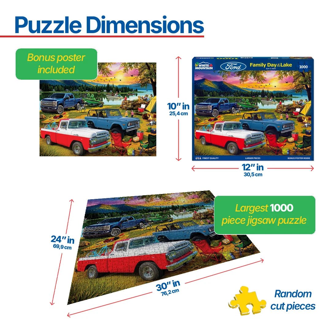 2112 Family Day at the Lake. Escape to the great outdoors – Ford style. From sunrise adventures to sunset memories, the spirit of the great outdoors shines bright in this 1000 piece jigsaw puzzle created by artist D.S. Valori. Whether hauling kayaks to the water’s edge, towing a fishing boat to your favorite lake, or cruising in classic style to a campsite, Ford is bult for every moment of fun. Finished size 24" x 30".