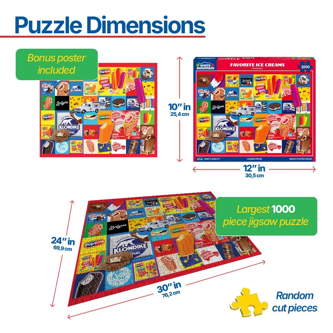 2103 Favorite Ice Creams. Summer favorites, birthday treats, and the perfect remedy for whatever ails you, there is always room for ice cream. Klondike, Breyers, Good Humor, and Popsicle. No matter the brand you prefer, designer Doug Banks gathered images of your favorite frozen treats in this 1000 piece jigsaw puzzle. Finished size 24" x 30".