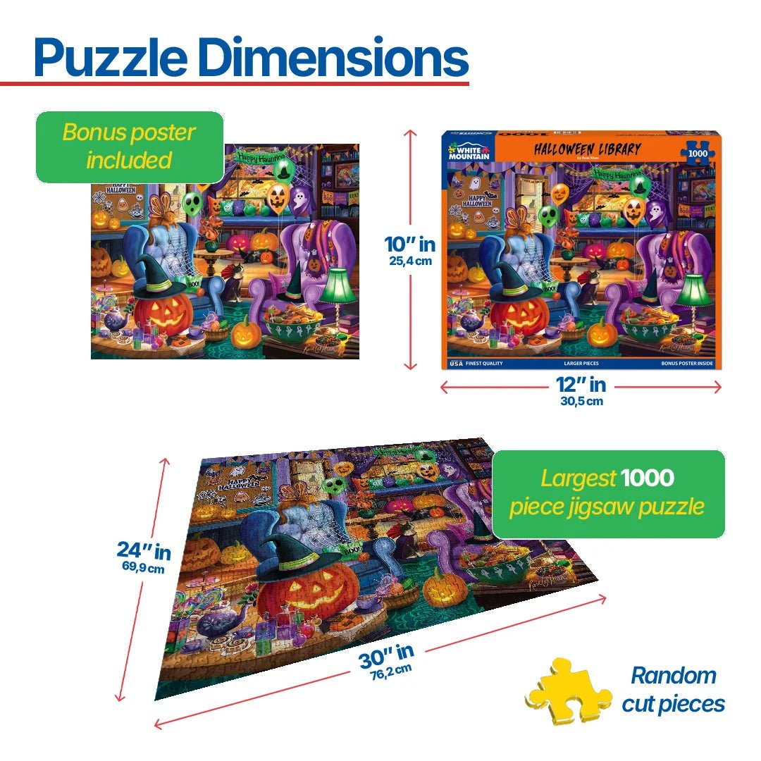 2125 Halloween Library. The pumpkins are a glow and even the cats have dressed for the occasion! The library is packed with Halloween cheer - from the cauldrons and floating ghost balloons to trick-or-treat candy galore. Artist Rose Khan created this 1000 piece jigsaw puzzle that will have you reaching for the nearest lollipop and looking up costumes for your furry family members. Finished size 24" x 30".