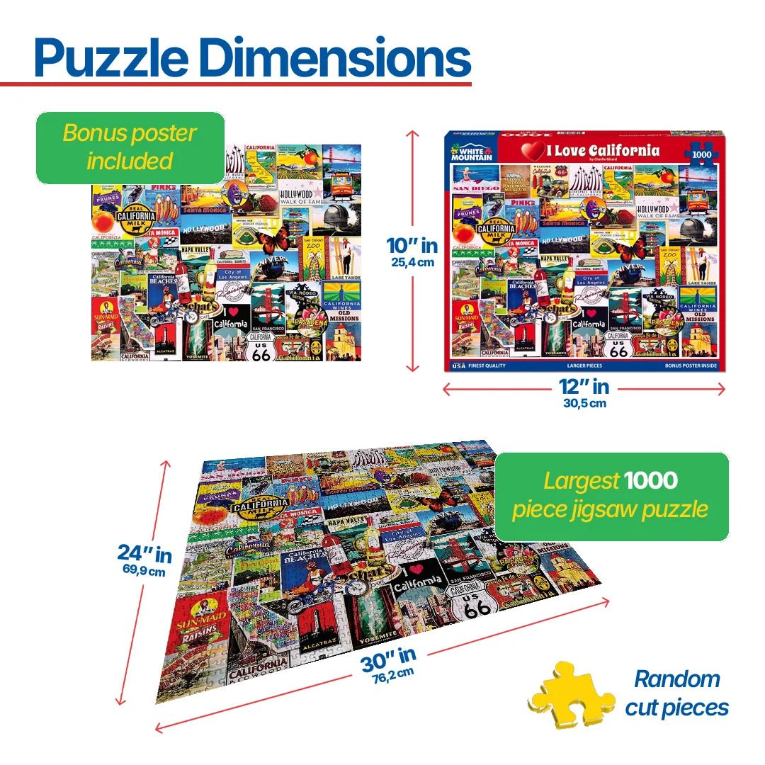 1161 I Love California. This collection of vintage ads & signs invite you to visit the California State Railroad Museum, the Aerospace Museum of CA, Dodger Stadium, the Hollywood Walk of Fame, the San Diego Zoo, Disneyland, Space Mountain and Universal Studio. Follow signs directing you to old missions, beaches, redwoods, Alcatraz, Rodeo Drive, Napa Valley, Los Angeles, Santa Monica, Pasadena, U.S. Route 66, Lake Tahoe, San Francisco, San Diego and the iconic HOLLYWOOD sign. All this travel might make you hungry so you can choose from Sun-Maid & California Raisins, a California Burrito, Gourmet Pitted Prunes, California oranges and strawberries while sipping Gallo Wine or "Real California Milk", or you can dine at Schat's Café or Pink's Hot Dogs. Heaven in a 1,000 piece puzzle with a finished size of 24” X 30”.