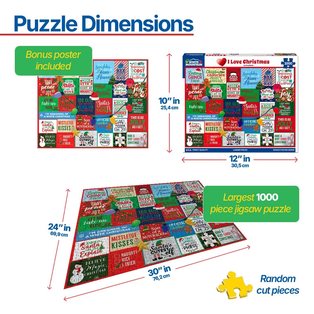 2153 I Love Christmas. Tis the season to be punny! From “Resting Grinch Face” to “Mistletoe Kisses” this festive collection is packed with Christmas humor, heart, and holiday sparkle! Artist Doug Banks reminds you to laugh, smile, and celebrate the most wonderful time of year – one merry piece at a time in this 1000 piece collage style jigsaw puzzle. Finished size 24" x 30".