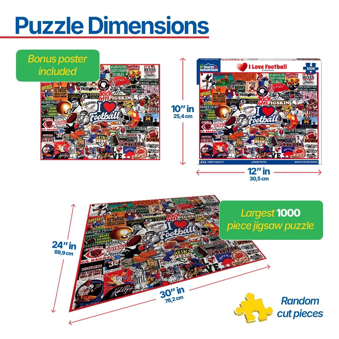 1771pz I Love Football. Calling all football fans. Artist Charlie Girard has gathered slogans, stadium names, famous players, and more in this 1000 piece collage style jigsaw puzzle. Finished size 24" x 30".
