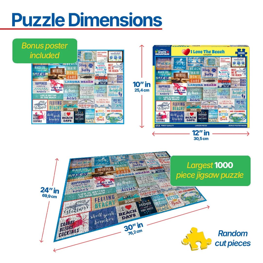 2073 I Love the Beach. From Beach Hair Don’t Care to Salty Water Heals Everything. Artist Doug Banks gathered sayings that will make beach lovers smile in this 1000 piece collage style jigsaw puzzle. Finished size 24" x 30".