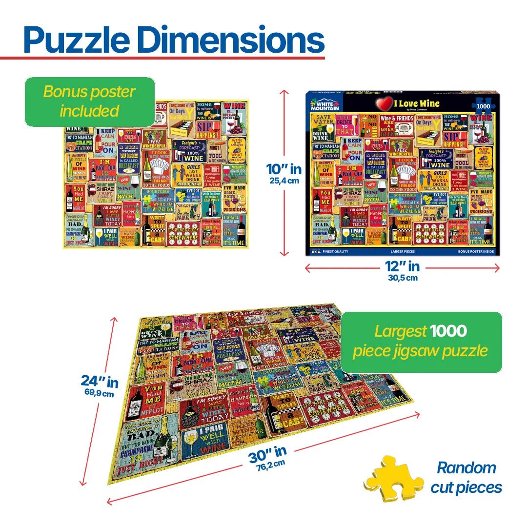 1840 I Love Wine. Nothing goes better with a glass of wine than wine humor. Artist Steve Cameron gathered wine related sayings you may or may not have heard in this 1000-piece collage style jigsaw puzzle. How many can you relate with? Finished size 24" x 30".