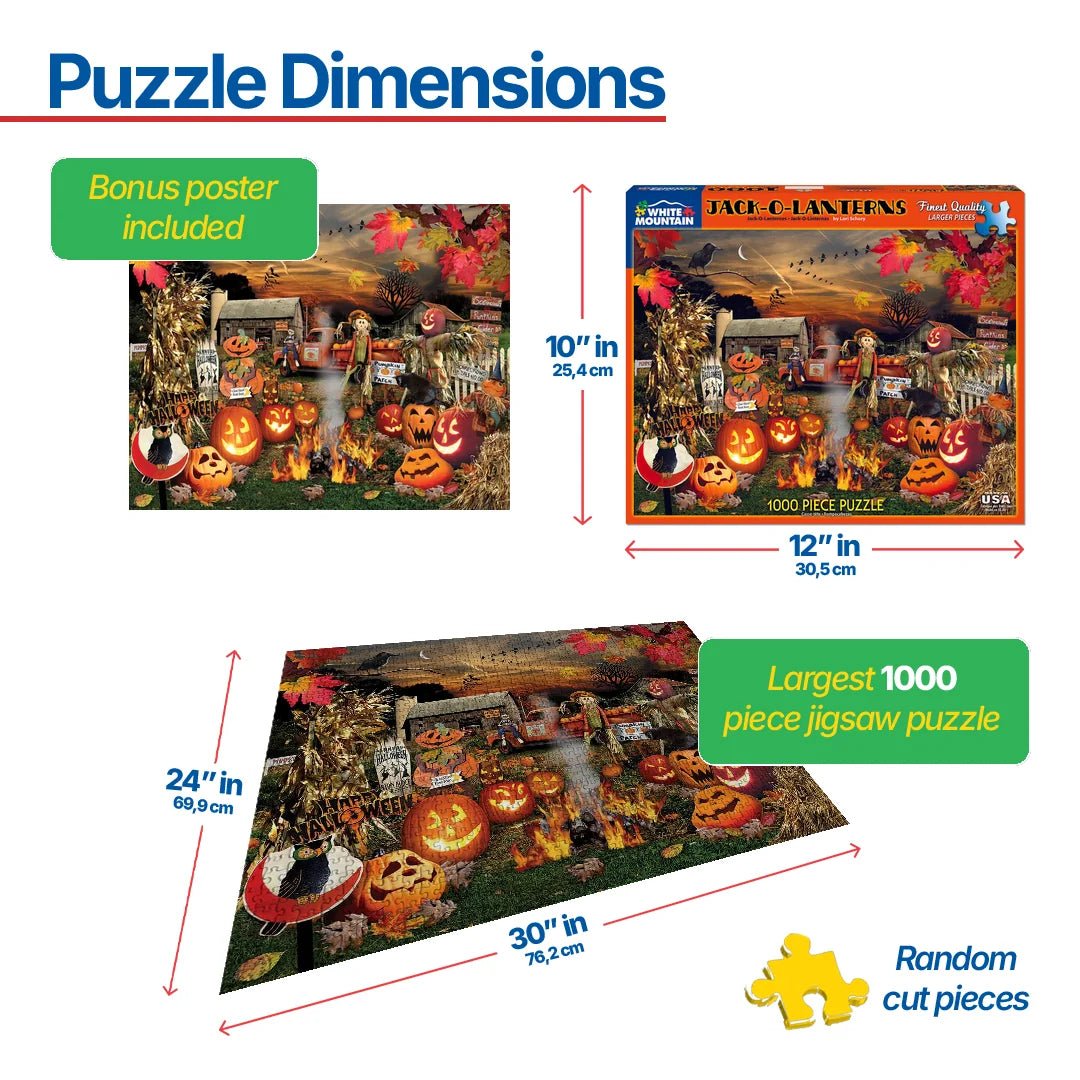 1120 Jack-O- Lanterns. Enter this spooky jack-o-lantern Halloween farm at your own peril! A raven, a black cat and an owl join with scarecrows to usher you in past crackling flames, while a v-formation of geese beat a hasty retreat from the airspace above. Artist Lori Schory. 1,000 pieces.
