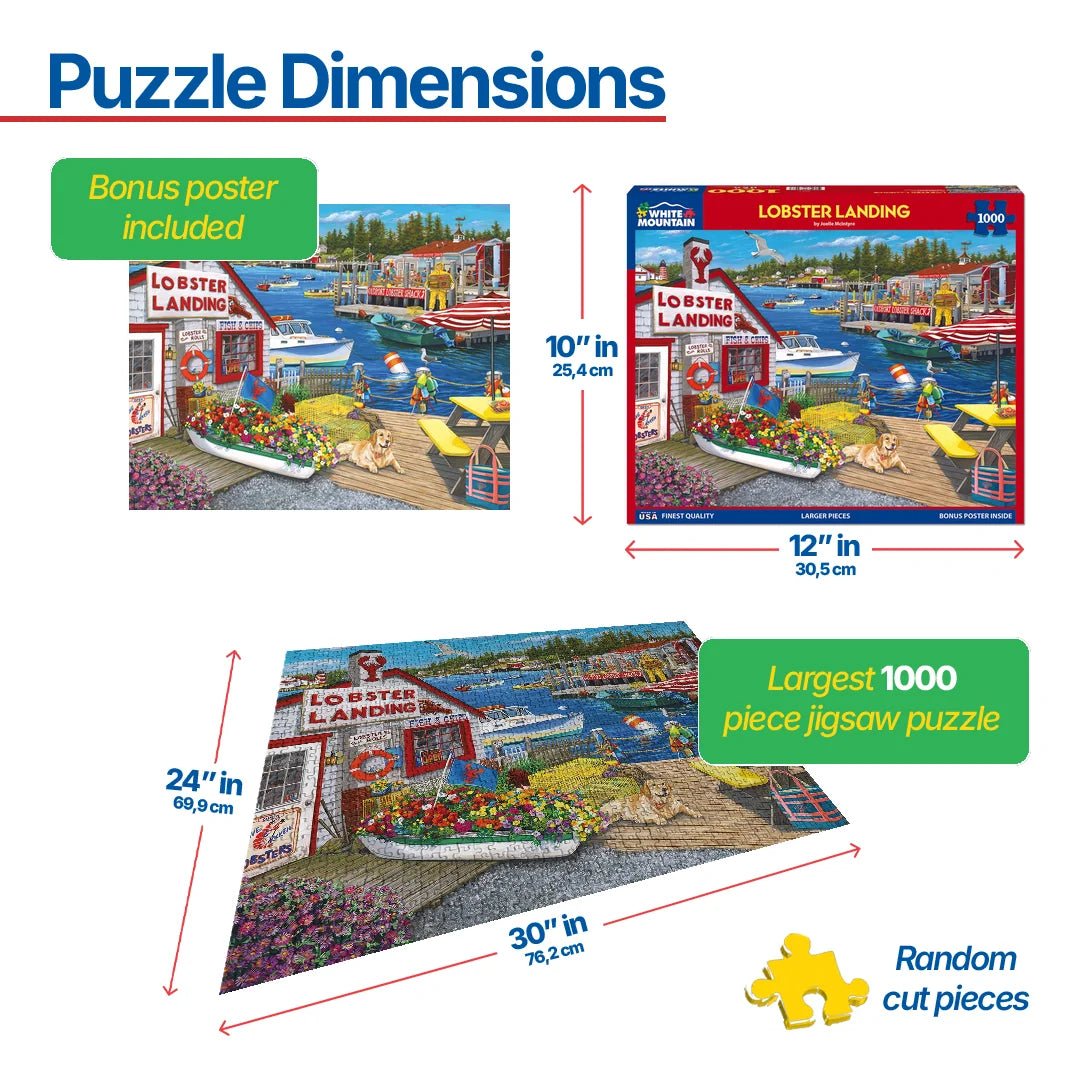 2032 Lobster Landing. Grab your lunch from Lobster Landing and enjoy the best view in town. Take a seat at the picnic table and enjoy the gentle breeze glides along the water providing relief from the summer heat. The furry host is currently taking a break, laying out on the deck and basking in the sun. Artist Joelle Mcintyre brings the lobster to you in this 1000 piece jigsaw puzzle. Finished size 24" x 30".