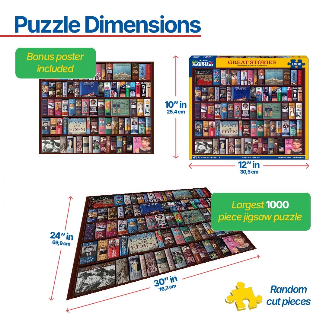 1790pz Great Stories. From the incredible artist, J. Scott Nicol, each book jacket in this puzzle has been hand painted in incredible detail. Any avid reader will love this collection of classics and biographies featured in this amazing artwork. 1000 piece jigsaw puzzle. Finished size 24" x 30".
