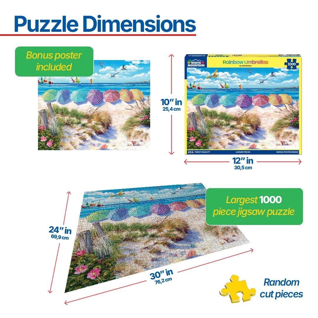 1954 Rainbow Umbrellas. Butted up against the sand dunes, a colorful array of umbrellas provides shade for its owners while creating a rainbow above the sand. Artist Joelle McIntyre designed this fun and fancy-free 1000 piece jigsaw puzzle for all the beach lovers out there that wish they could sink their feet in the sand and gaze out at the sail boats beyond the waves. Finished size 24” x 30”.