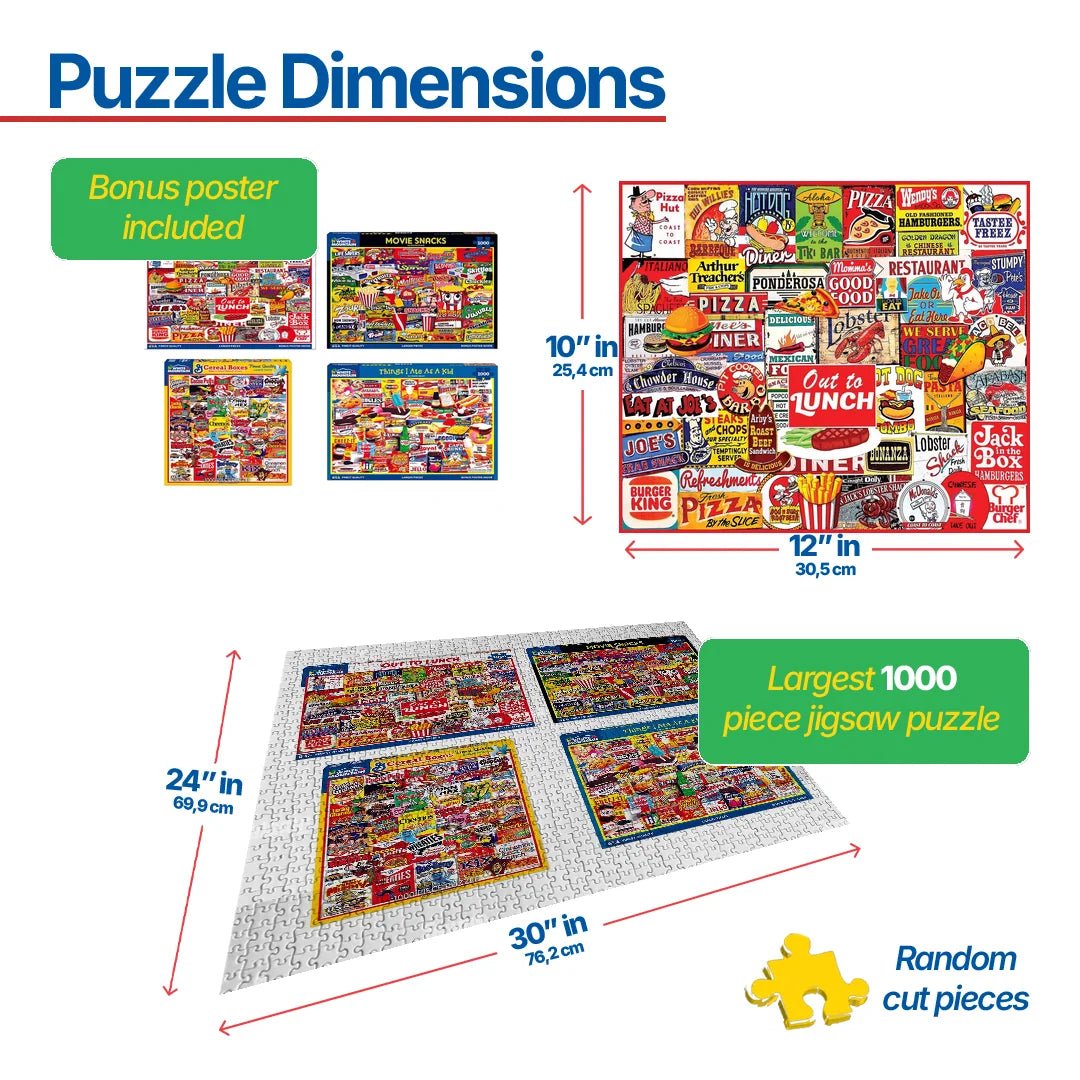 1884 Movie Snacks. Popcorn, Red Vines, Cookie Dough Bites, and more. The best part of going to the movies are the Movie Snacks. We may bicker about what to get but we can all agree that junk food tastes better at the theater. Artist Charlie Girard compiled all the favorites in this 1000 piece collage style jigsaw puzzle. Finished size of 24” x 30”.