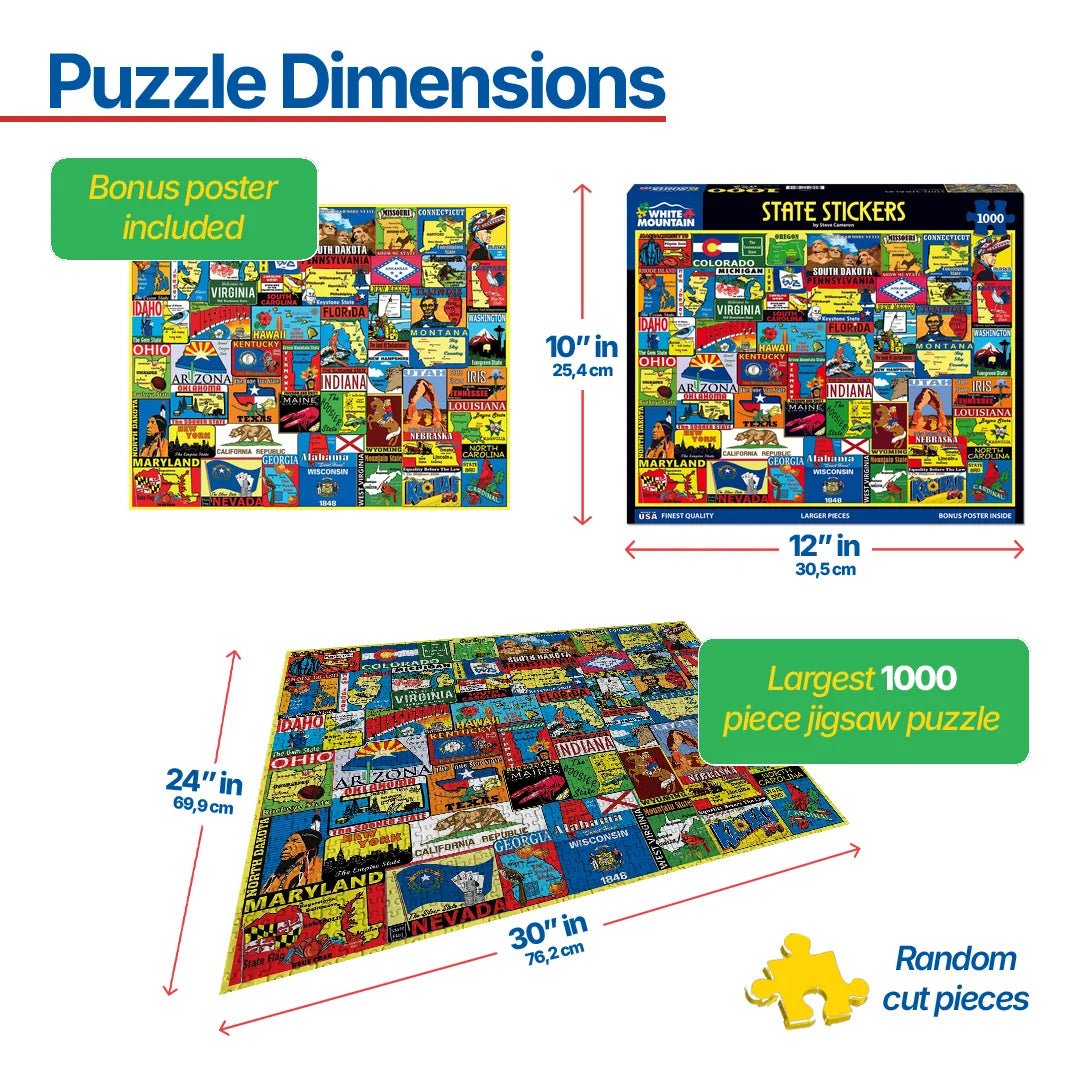 1661 State Stickers. Travel the United States with us. Do you know what each state is known for? From flags to slogans to state birds, this puzzle is both fun and a test of knowledge. Designer Steve Cameron has assembled this colorful collage to test your wit and take you on a road trip from your living room. State Stickers is a 1,000 piece puzzle with a finished size of 24" x 30".