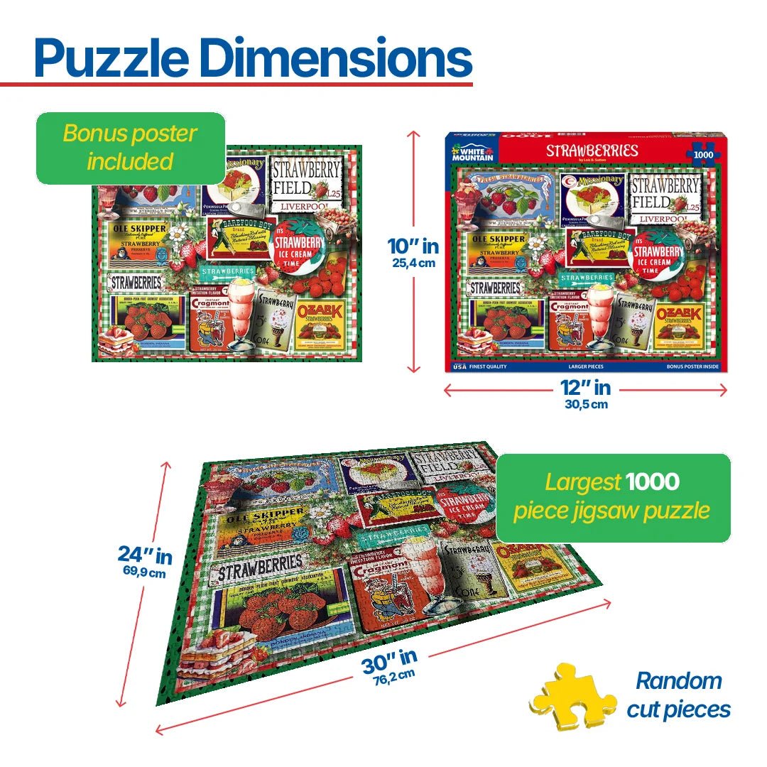 1878 Strawberries. Strawberry ice cream, strawberry topping, and strawberry milk shakes and strawberry jam. Adding strawberries to anything makes it healthy right? Artist Lois Sutton collected vintage strawberry ads and labels to create this 1000 piece jigsaw puzzle just for you. Finished size of 24” x 30”.