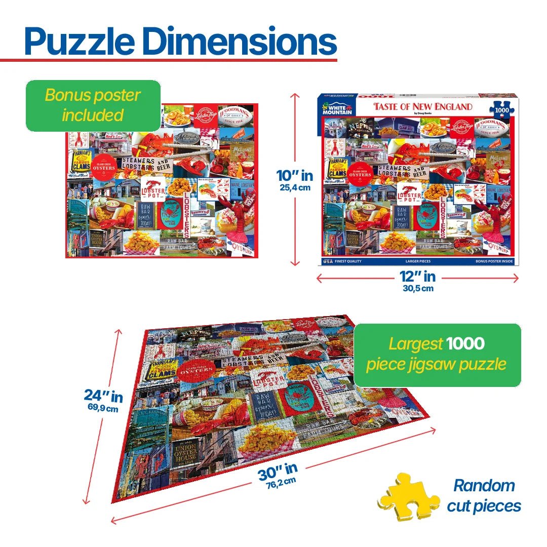 2102 Taste of New England. Fresh and locally sourced, New England is known for its regional fare. Lobster rolls, clam chowder, fried clams, fresh shucked oysters and more. Designer Doug Banks reminds us to visit local restaurants and enjoy what New England has to offer in this 1000 piece jigsaw puzzle. Finished size 24" x 30".