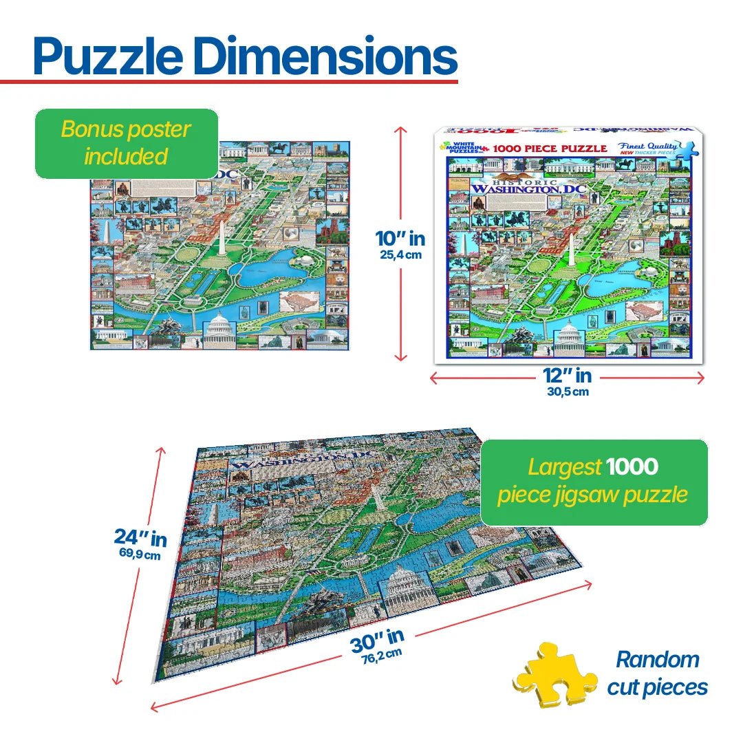 This historic Washington, DC puzzle provides a superb overview of Washington, DC's famous monuments and historic buildings and is filled with fascinating facts about our nation's capital. Get the history behind the Jefferson Memorial, Washington Monument and more. It's a great learning tool and fun for the entire family. Major Washington, DC streets are named and laid out for you to take a virtual walking tour of the city. What better way to prepare for a visit there, or to renew your memories of it once you return home? Artist: Dana Gaines 1000 Piece Jigsaw Puzzle. Finished size 24" X 30"