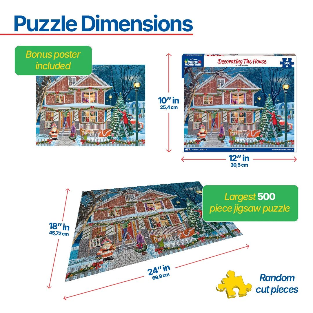 1972 Decorating the House. Christmas is in the air. The family is outside working together to transform the house into a magical messenger of merriment for all those that see. With lights, garland, trees, and Santa no one can walk by without smiling. Artist Victor McLindon designed this fun and festive 500 piece jigsaw puzzle to make you smile. Finished size of 18” x 24”.