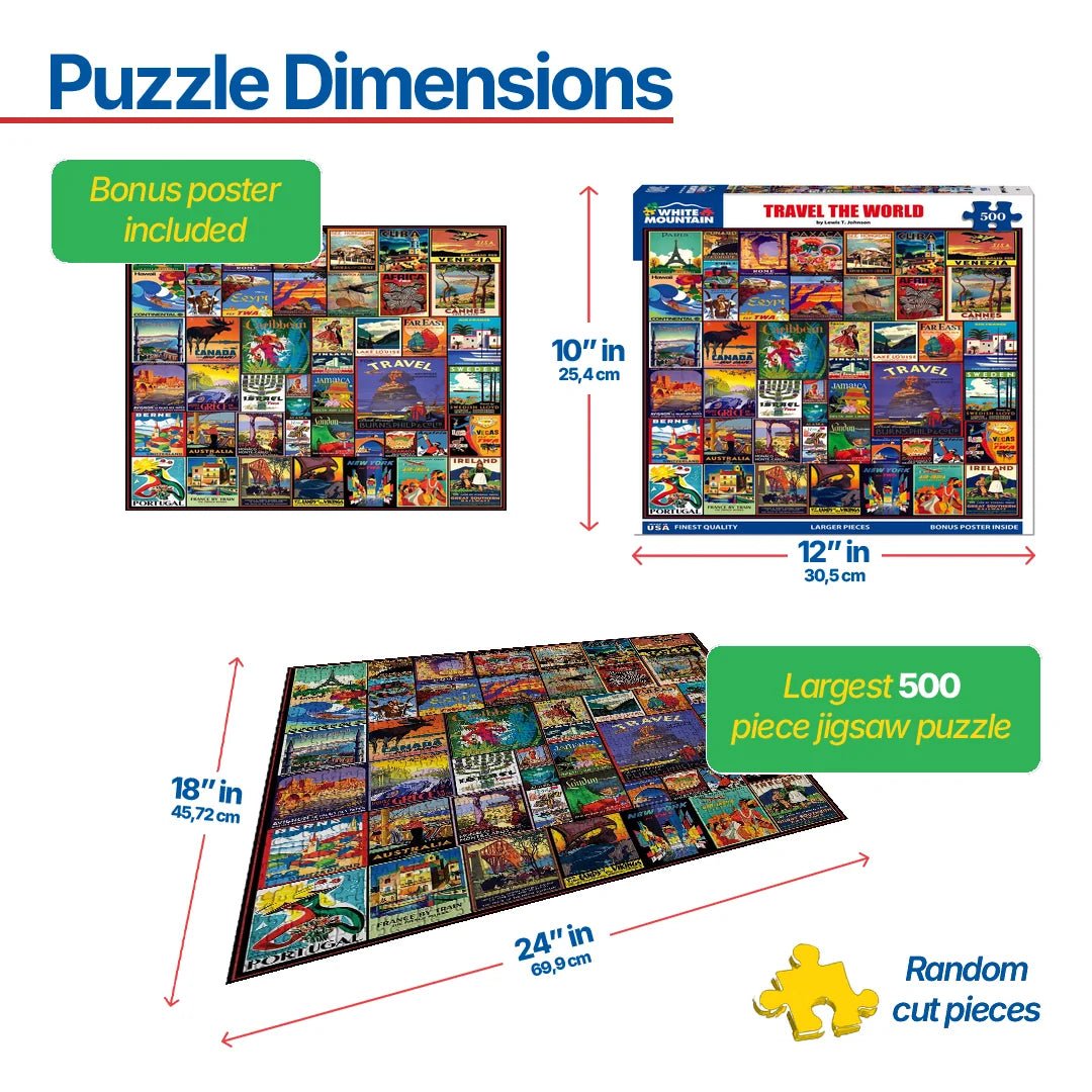 1153 Travel the World. Take a trip from the comfort of your own home with this exciting puzzle by Lewis T. Johnson. Beautiful vintage posters take us to Cuba, Israel, India, France, Switzerland, Monaco, Australia and Ireland, to name just a few destinations. 500 Piece Jigsaw Puzzle.