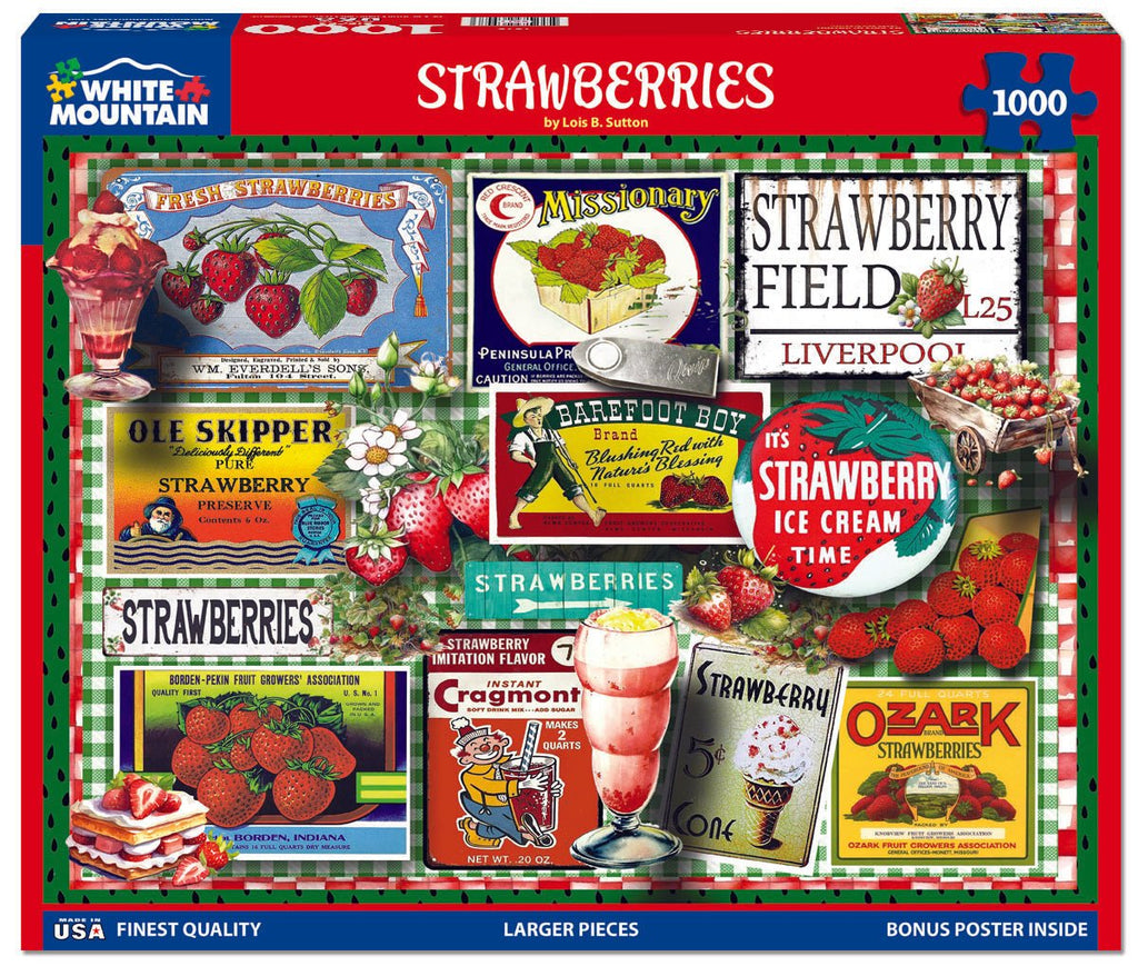 1878 Strawberries. Strawberry ice cream, strawberry topping, and strawberry milk shakes and strawberry jam. Adding strawberries to anything makes it healthy right? Artist Lois Sutton collected vintage strawberry ads and labels to create this 1000 piece jigsaw puzzle just for you. Finished size of 24” x 30”.