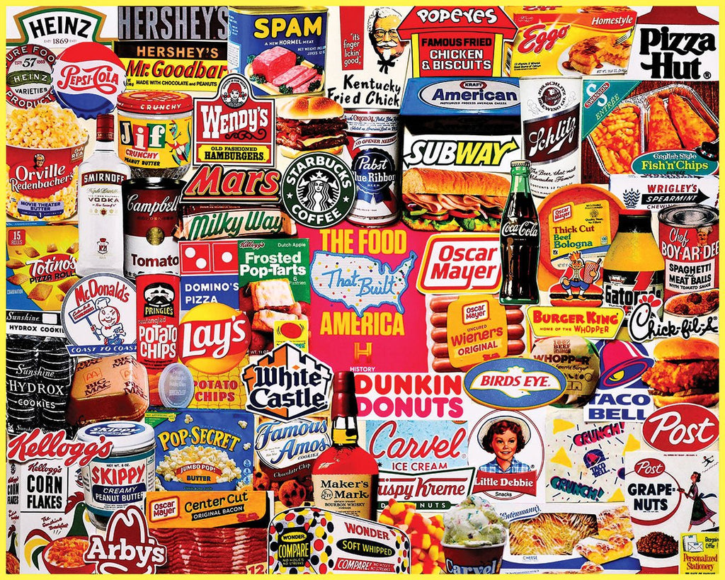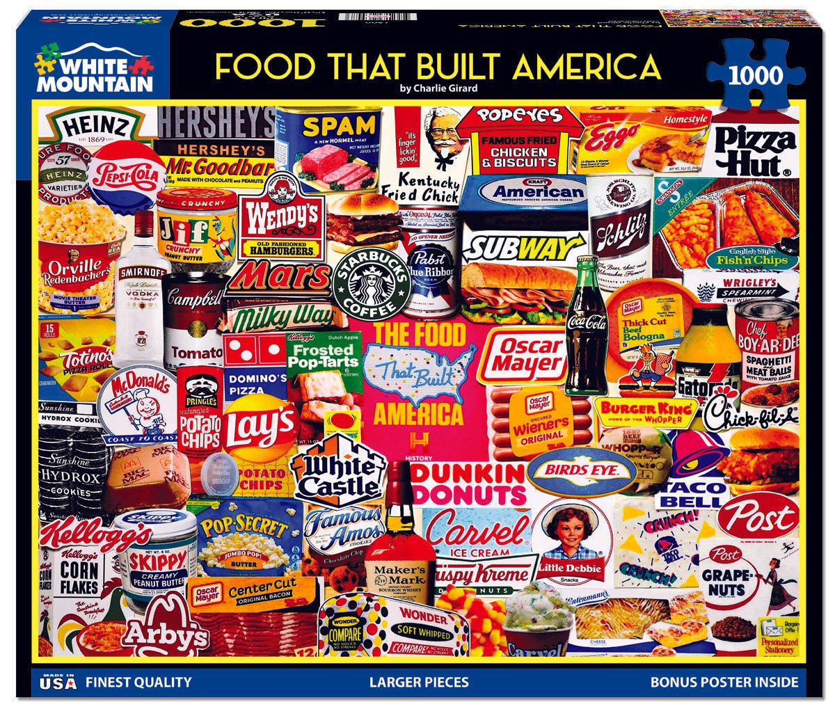 1900pz Foods that Built America. Here is another great collage from designer Charlie Girard. This time, Charlie gathered the Food the Built America. From fast food to snacks and pantry staples to alcohol this puzzle has foods everyone has tried. Which ones did you eat growing up and what do you consume today? 1,000 piece puzzle with a finished size of 24" x 30".