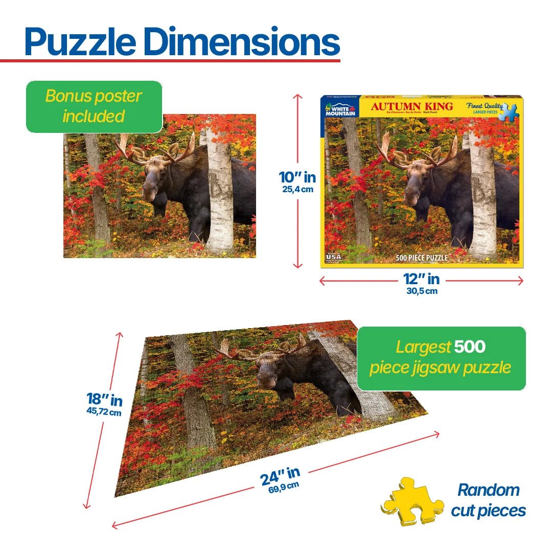 1419 Autumn King. Big fellows like this one are a common sight on our roadways here in New Hampshire. It’s wise to be on the lookout for them when driving, especially at dawn or dusk, as a car is usually on the losing end in an encounter with a moose. This guy is keeping a sharp eye on us and might be thinking he’s camouflaged by the birches and the colorful autumn leaves! This beautiful photograph comes to us from Mark Picard. 500 piece puzzle with a finished size of 18” x 24”.