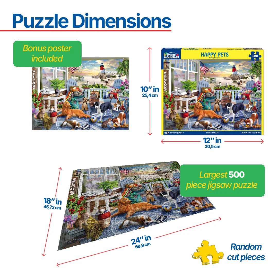 1847pz Happy Pets. Its a beautiful day at the beach. While their families have fun on the sand, the pets congregate on the porch. Some play while others choose to lounge around and enjoy the sea breeze. Designer Mary Thompson brings both playful pooches and fun-loving felines to you in this 500-piece jigsaw puzzle. Finished size of this puzzle is 18" x 24".