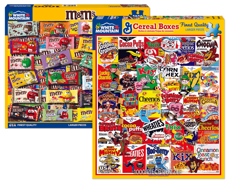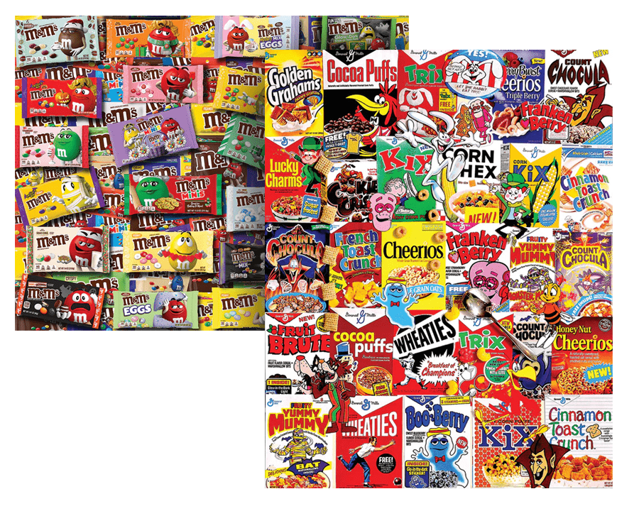 Here's our new and improved image of this super-popular puzzle with all new artwork from General Mills. Imagine yourself watching Saturday morning cartoons with a heaping bowl of Cocoa Puffs, Kix, or Lucky Charms. Perhaps you're a bit more mature and prefer Cheerios, Total, or Wheaties - but never forget, Silly Rabbit, Trix Are For Kids! 1,000 pieces with a finished size 24" x 30".