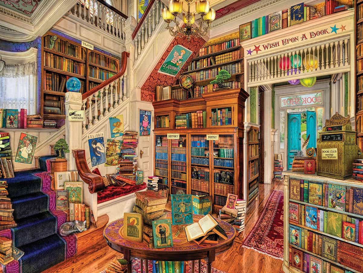 The amount of detail in this painting is astonishing! You'll be immediately drawn into this magical shop with stacks of tomes offering the classics, history, poetry, travel and much more. Find a cozy nook to settle into upstairs or downstairs and "wish upon a book". If you're lucky, the resident kitty might curl up on your lap. Artist Aimee Stewart. 1,000 pieces. Finished size 24" x 30".