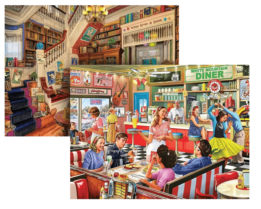 There’s always a warm welcome here at the local diner, which could be pretty much anywhere in the U.S. Drop a few coins in the jukebox and twirl your girl while you wait for breakfast, lunch or just a milkshake. From the checkerboard tile to the vinyl and chrome stools to the memorabilia on the walls, this is pure Americana as envisioned by English artist Steve Crisp. This is our standard 1000 piece puzzle which is 30"x24".