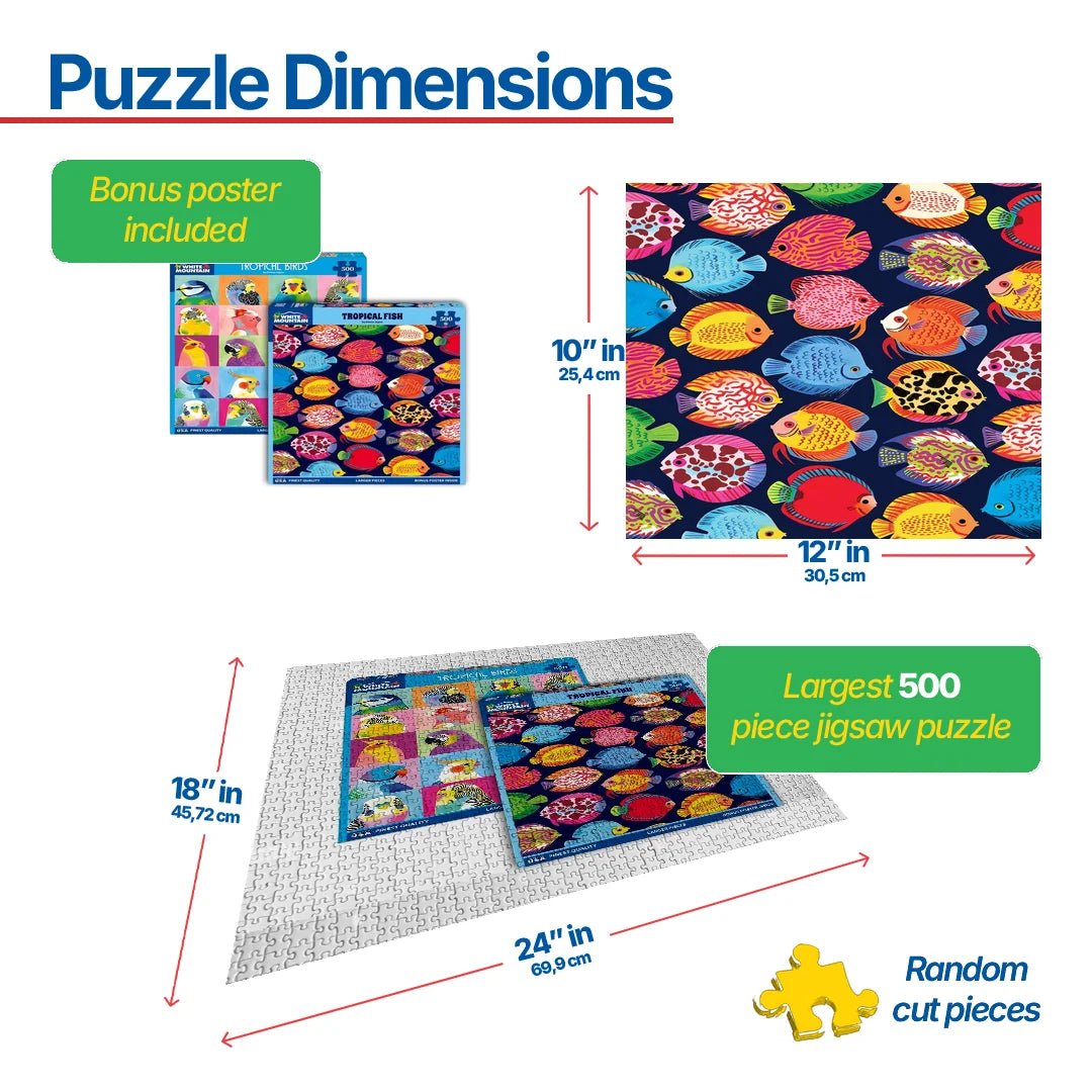 Tropical Fish. Colorful “disk” fish make this 500 piece jigsaw puzzle both fun and a little challenging. Artist Emma Jayne catches the vibrant intensity of color that matches the tropics in which these fish reside. Finished size of 18” x 24”.