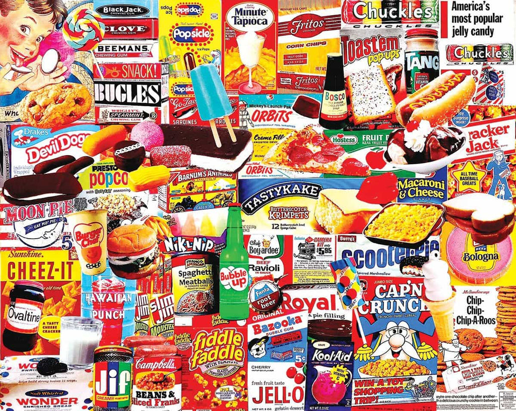Things I Ate As A Kid. And chewed. And drank. And slurped. And blew bubbles with. They're all here, causing sugar overload and making us hungry for more, assembled in a colorful jumble by Charlie Girard for a 1,000 piece puzzle. Finished size 24" x 30"