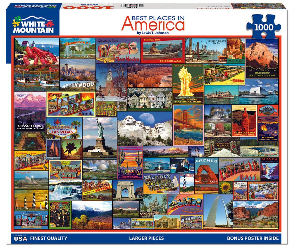 Greetings from some interesting tourist sites and welcome to several of our national parks on a colorful collection of post cards assembled by Lewis T Johnson for this 1,000 piece puzzle.