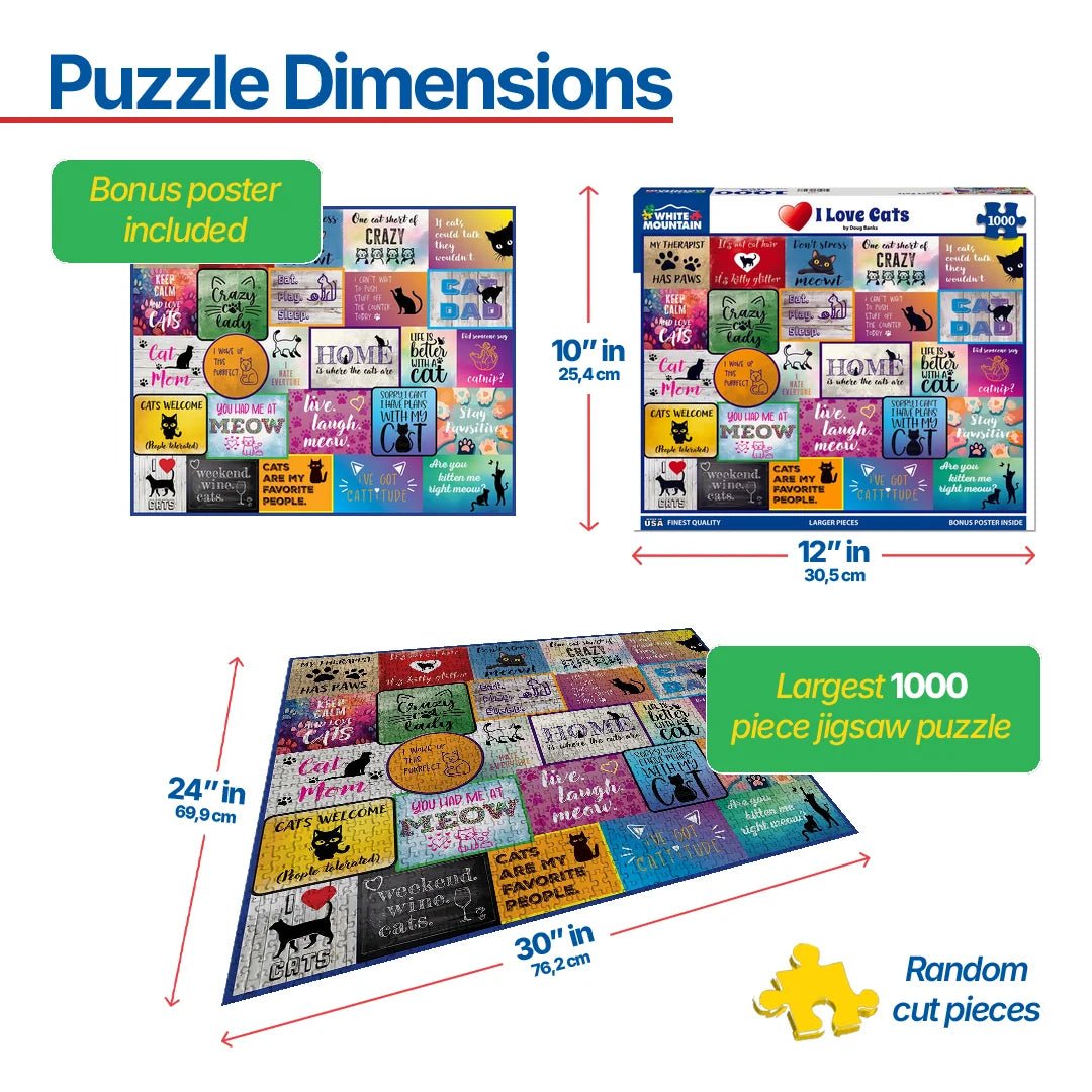 1985 I Love Cats. One Cat Short of Crazy, You Had Me at Meow and soooo many purr-fect sayings that only cat parents can understand. This 1000 piece collage style jigsaw puzzle consists of light hearted sayings and funny expressions cat owners can agree with. Designer Doug Banks created this puzzle with your furry and sometimes stubborn friend in mind. Finished size 24" x 30".