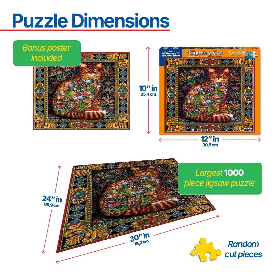 Lots of wonderful surprises can be found in this challenging Tapestry Cat jigsaw puzzle by artist Lewis T. Johnson 1000 Piece Jigsaw Puzzle. Finished size 24" X 30".