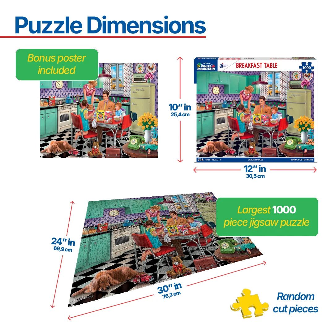 1675 Breakfast Table. It’s a quiet start to the day. As the family dog rests on the floor beside the table, mom serves dad pancakes and the kids eat their favorite cereal. Toys strewn about signify the kids had already begun playing before they were called to eat. It’s almost 7am which means the neighborhood is awake. A school bus passes by the kitchen window but the kids in this house are still too young to attend. Dads’ briefcase is on the floor near the phone so he can grab it on the way out the door. Artist P.D. Moreno allows us to have breakfast with the family in this vintage inspired 1000-piece jigsaw puzzle.