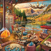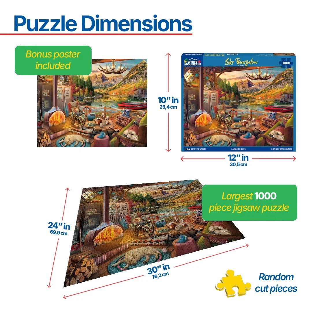 2066 Lake Bungalow. Its autumn and the first snow has already fallen high in the mountains. There's a slight chill in the air but nothing the fireplace can’t combat. Trying to soak up the last bit of sun, a kayaker glides across the water watching the ducks swim nearby. After a long day of playing, two puppies are trying to make their way over to their siblings on the comfy couch or their mom laying on the floor in front of the fire. Artist Eduard brings the beauty of the outdoors in autumn to you in this 1000 piece jigsaw puzzle. Finished size 24" x 30".