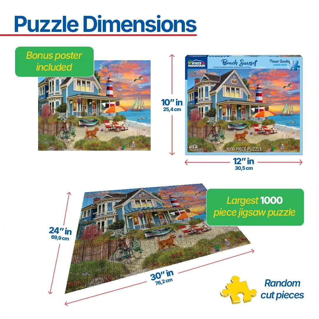 1731 Beach Sunset. Summer sunsets are always beautiful at the beach house. The sea is calm, perfect for sailing. Sit on the porch with a glass of ice tea while petting the cat and watching the dog play on the beach. Sandpipers run up and down the coast avoiding the incoming waves. Designer David Maclean takes you to the beach without leaving your home in this 1000 piece jigsaw puzzle. Finished size of 24” x 30”.