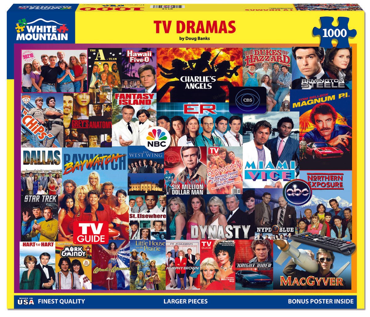 2115 TV Dramas. Before streaming and DVR you had to plan ahead to make sure you were able to watch the newest episode of your favorite TV drama. Do you remember making sure the VCR was set to record your favorite shows or making plans around your shows? Designer Doug Banks collected posters of popular TV Dramas spanning 3 decades in this 1000 piece collage style jigsaw puzzle. Finished size 24" x 30".