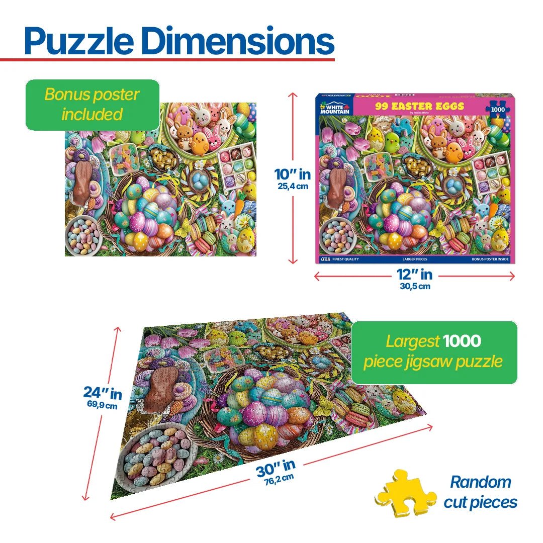 1919pz 99 Easter Eggs. Macaroons, cookies, cupcakes, and more. Designer Jessica White created a colorful jigsaw puzzle that is not only beautiful and fun but puts you into the Easter spirit. Grab your snacks because once you get started you wont want to stop until its completed. 1000 piece jigsaw puzzle with a finished size 24" x 30".