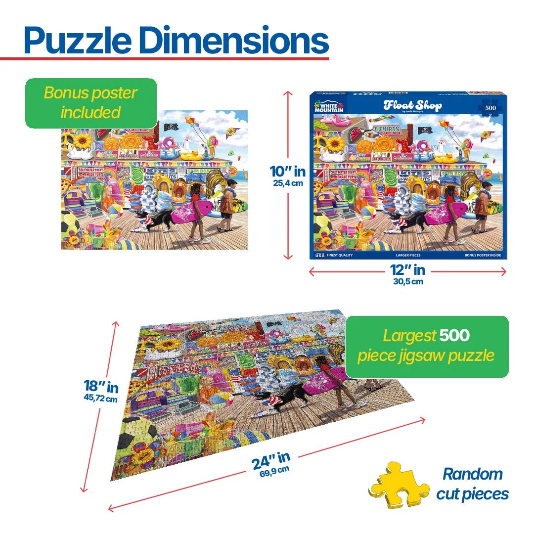 1854pz Float Shop. Stop at the float shop for all your beach needs. Not only do they offer inflatables in all shapes and sizes, the float shop can assist with all your beach needs and guarantee a successful beach trip. From candy to ice cream and skim boards and swim suits step onto the pier and into your new favorite spot. Artist Joelle McIntyre brings the bright colors and sea breeze to you in this 500 piece jigsaw puzzle. Finished size of this puzzle is 18" x 24".