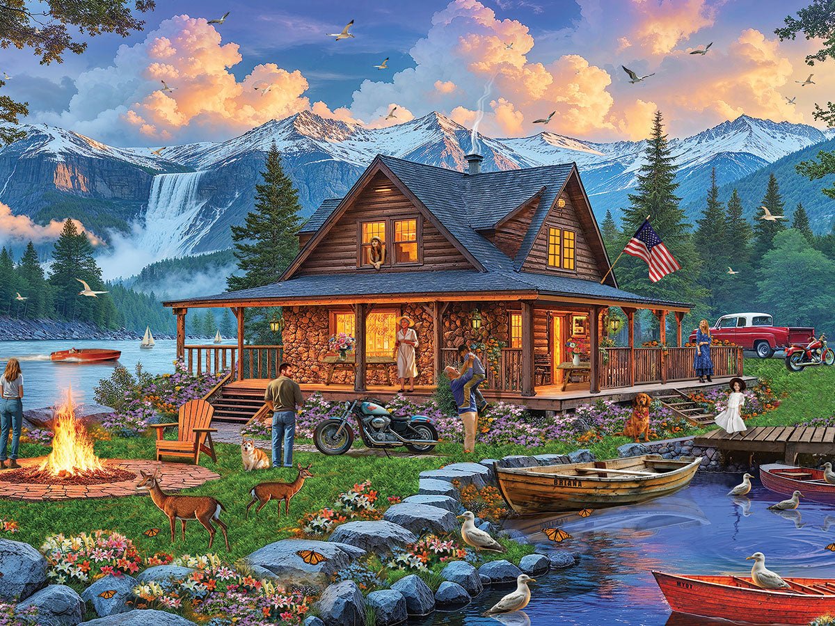 2166 Cabin Retreat. Where Spring evenings glow, laughter lingers, and home feels like a memory you never want to leave. Artist John Enright invites you to join a place where stories are shared by firelight and everyday ends on the porch in this 500 piece jigsaw puzzle. Finished size of 18” x 24”.