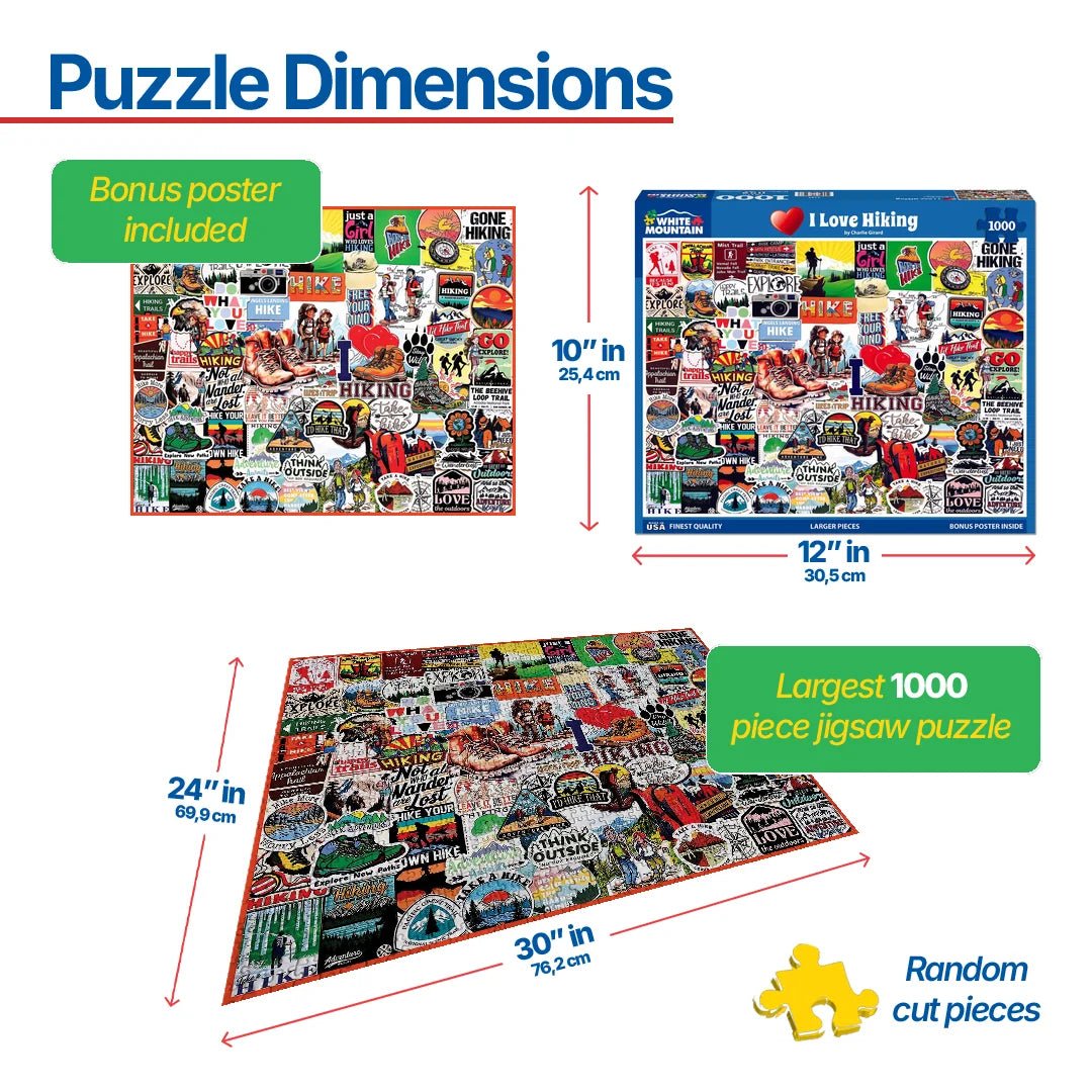 2172 I Love Hiking. Celebrate the call of the trail with this vibrant, detail-packed 1000 piece hiking collage puzzle. Bursting with color, character, and outdoor inspiration, artist Charlie Girard brings together dozens of trail badges, vintage style stickers, and iconic phrases that capture the spirit of adventure. Finished size 24" x 30".