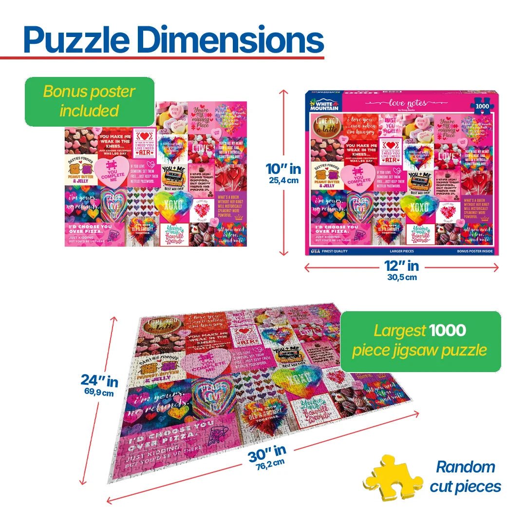 2168 Love Notes. Fall in love with this collection that celebrates every shade of sweet, silly, and totally swoon-worthy romance. Artist Doug Banks created this vibrant 1000 piece collage style jigsaw puzzle that brings together playful puns, heartfelt moments, and laugh-out-loud sarcasm designed to capture the kind of love that feels fun, real, and perfectly imperfect. Finished size 24" x 30".