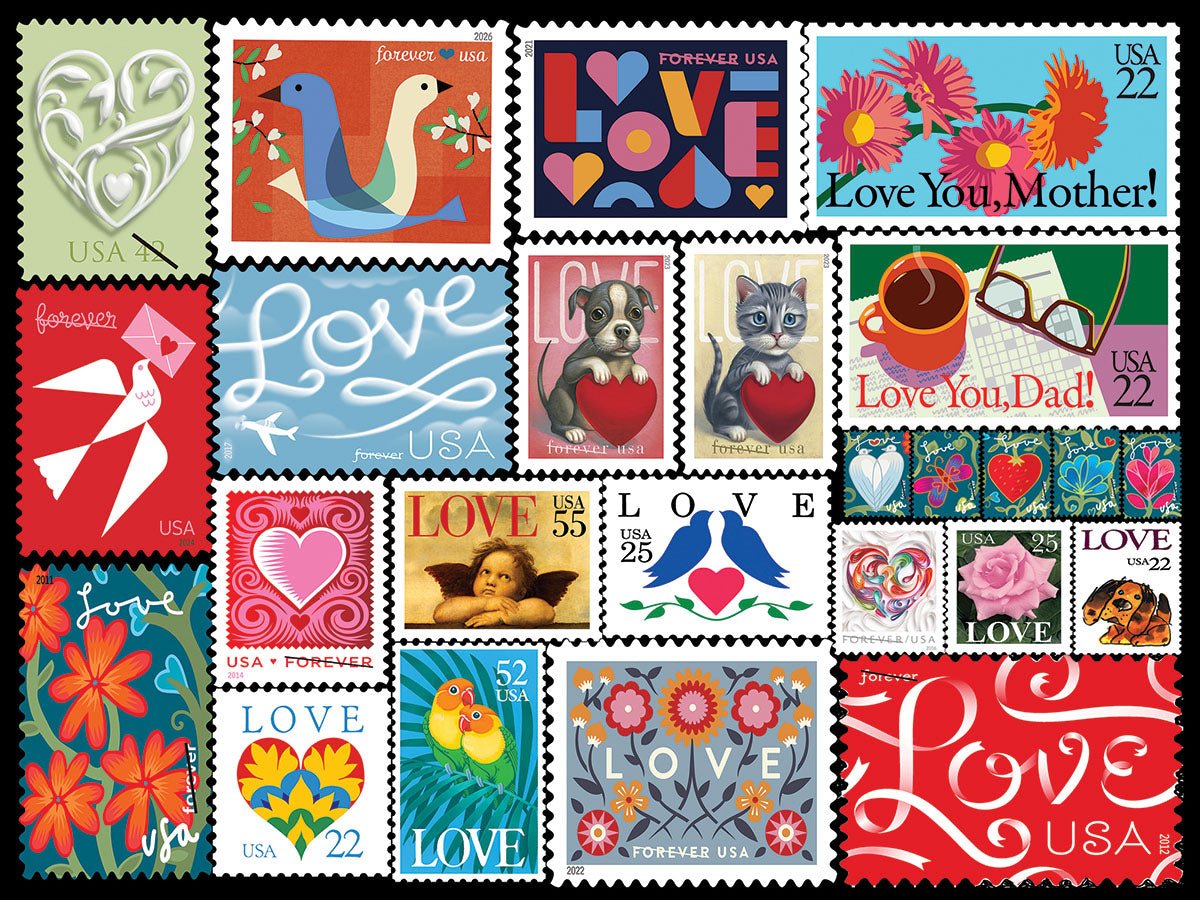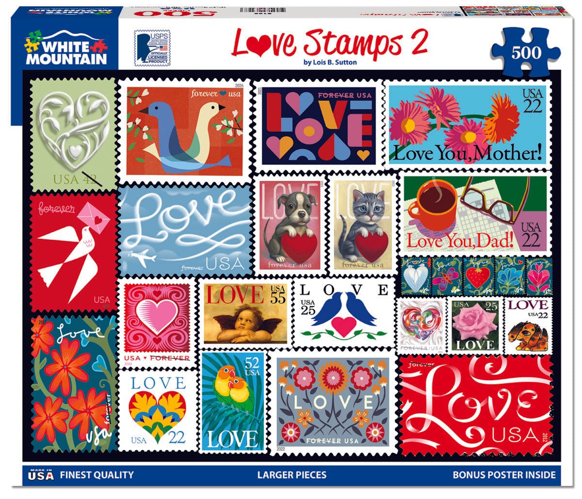 2188 Love Stamps 2. Love is in the air, love is on our minds and in our hearts, and love is in the U.S. Mail! Designer Lois B. Sutton has arranged this gorgeous collection of stamps that covers all the love. No matter who you love, there is a love stamp out there for you in this 500 piece collage style jigsaw puzzle. Finished size of 18” x 24”.