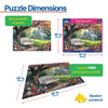 2158 Porch Puppies. Step into a heart melting slice of paradise where flowers bloom in full color and playful puppies turn the front yard into their own joyful playground. From wagging tails and chewing slippers to a sleepy pup napping in a little red wagon. Artist P.D. Moreno created a charming lakeside retreat that overflows with warmth, laughter, and pure happiness in this 1000 piece jigsaw puzzle. Finished size 24" x 30".