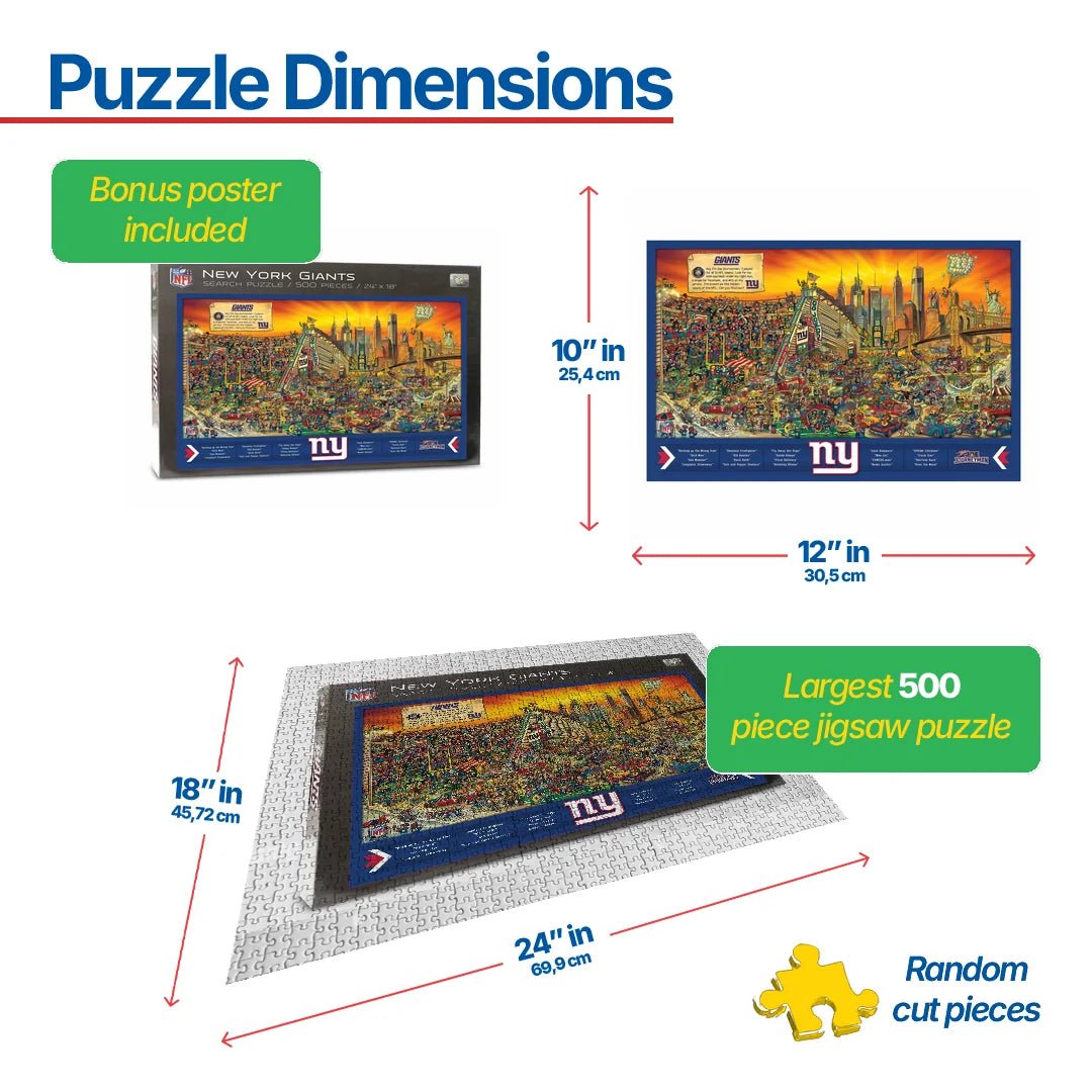 First you have to put the New York Giants puzzle together. Then you have to find Joe Journeyman - the only player to play for all 32 NFL teams - and discover dozens of laugh-out-loud scenes in these hand-drawn illustrations of NFL stadiums, their fans and their landmark surroundings. The Giants seek and find adventure puzzle is officially licensed by the NFL for use by Joe Journeyman, a YouTheFan brand.