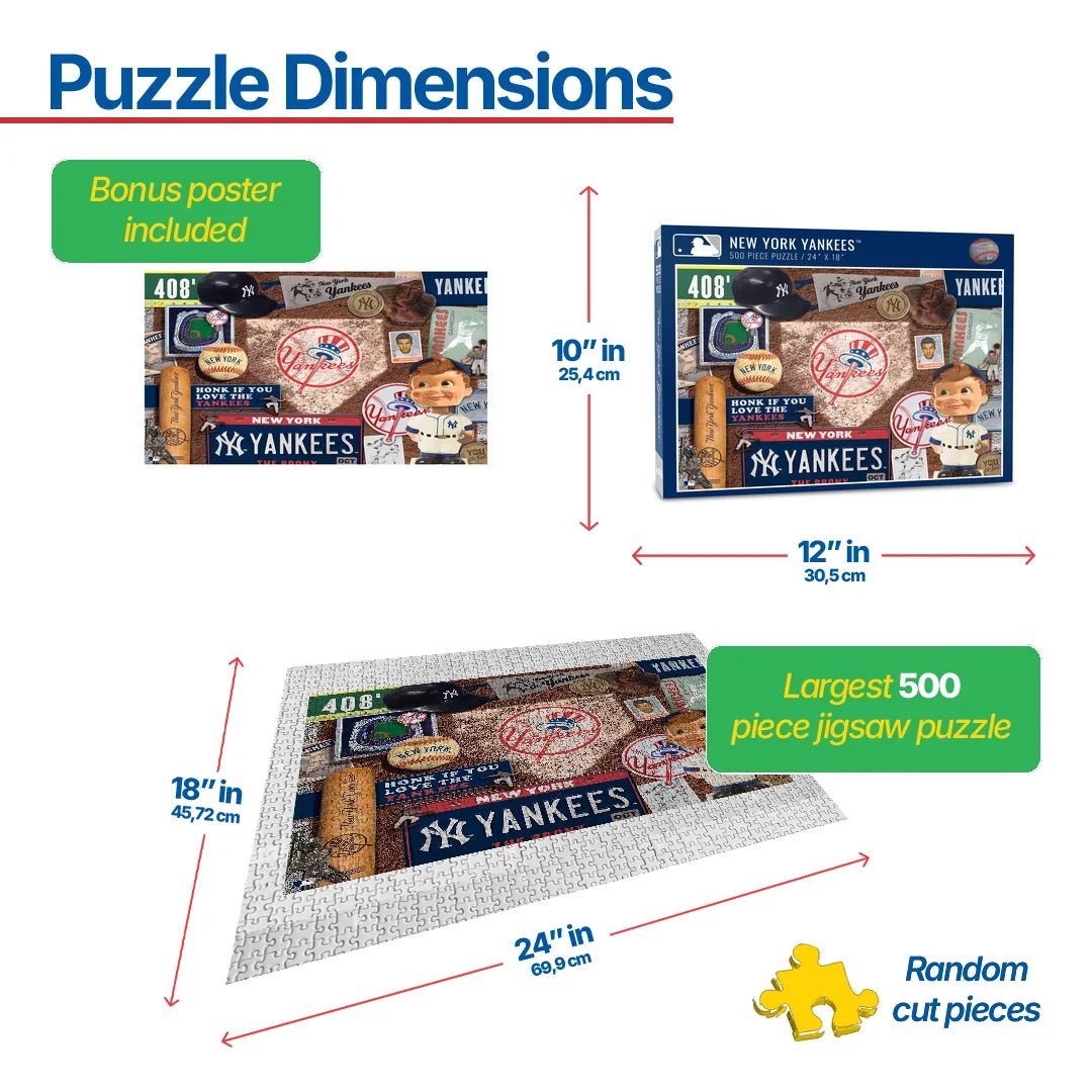 Celebrate your favorite team through the years with this 500-piece retro puzzle. Packed full of memorabilia, vintage programs, bobbleheads and other classic items, they’re a fun glimpse back in time at the history of your team. Carefully designed to feature each team’s unique slogans and stadiums, the Retro Team Puzzle is a great collectible for every fan – boy or girl, young or young at heart.